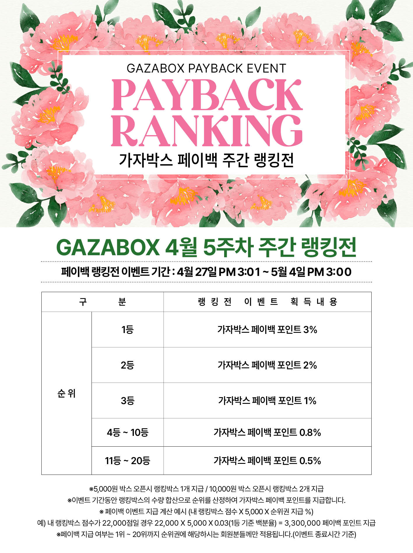 ※ 유의사항 -GAZABOX 회원만을 위한 이벤트입니다. -이벤트 당첨자는 이벤트 종료일 박스보관함을 통해 상품을 확인하실수 있습니다. -본 이벤트는 운영 상황에 따라 사전 고지 없이 변경되거나 종료될 수 있습니다. -랭킹전 진행시 회원님의 닉네임 변경을 하게되면 랭킹에 표기된 닉네임도 변경되어 표시 됩니다. 회원간의 오해가 생기지 않게 랭킹전 진행시에는 닉네임 변경을 지양하여 주세요. -개인정보의 수집 및 이용동의 *수집.이용목적 : 이벤트 경품 발송 *수집하는 개인정보 항목: (경품수령인명,휴대전화번호,경품받으실주소) *개인정보의 보유 및 이용기간 : 경품 발송후 정보 파기