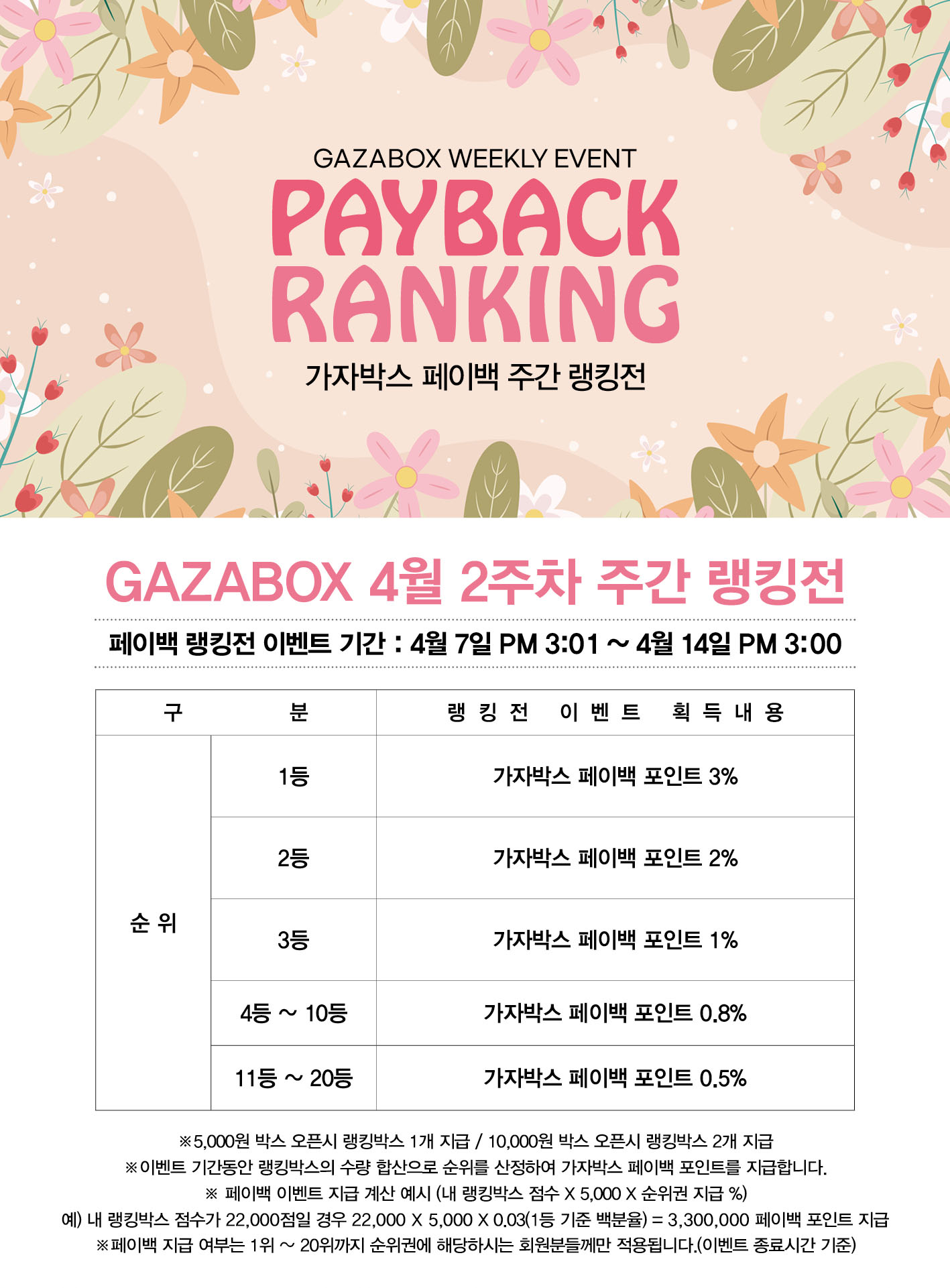 ※ 유의사항 -GAZABOX 회원만을 위한 이벤트입니다. -이벤트 당첨자는 이벤트 종료일 박스보관함을 통해 상품을 확인하실수 있습니다. -본 이벤트는 운영 상황에 따라 사전 고지 없이 변경되거나 종료될 수 있습니다. -랭킹전 진행시 회원님의 닉네임 변경을 하게되면 랭킹에 표기된 닉네임도 변경되어 표시 됩니다. 회원간의 오해가 생기지 않게 랭킹전 진행시에는 닉네임 변경을 지양하여 주세요. -개인정보의 수집 및 이용동의 *수집.이용목적 : 이벤트 경품 발송 *수집하는 개인정보 항목: (경품수령인명,휴대전화번호,경품받으실주소) *개인정보의 보유 및 이용기간 : 경품 발송후 정보 파기