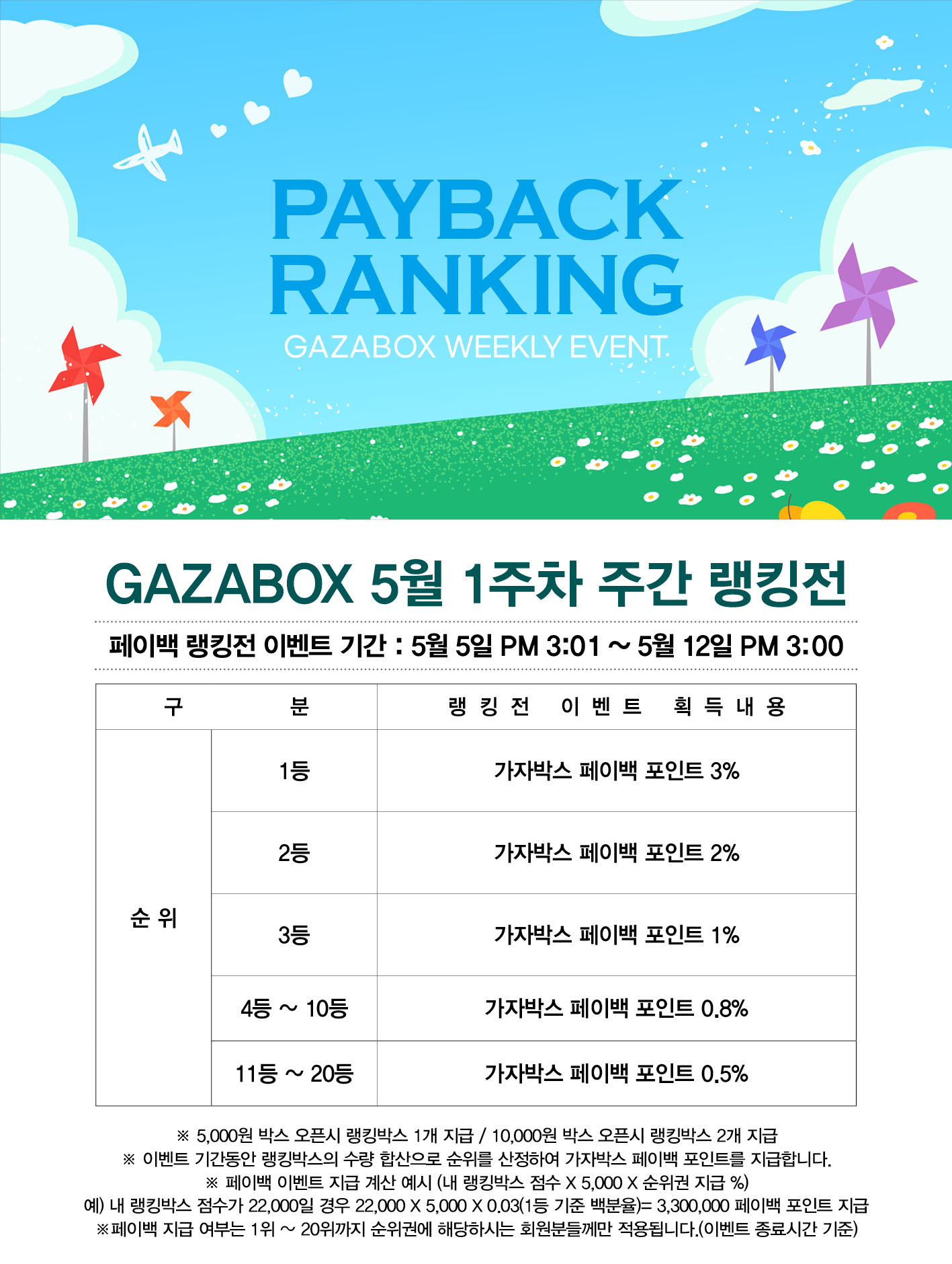 ※ 유의사항 -GAZABOX 회원만을 위한 이벤트입니다. -이벤트 당첨자는 이벤트 종료일 박스보관함을 통해 상품을 확인하실수 있습니다. -본 이벤트는 운영 상황에 따라 사전 고지 없이 변경되거나 종료될 수 있습니다. -랭킹전 진행시 회원님의 닉네임 변경을 하게되면 랭킹에 표기된 닉네임도 변경되어 표시 됩니다. 회원간의 오해가 생기지 않게 랭킹전 진행시에는 닉네임 변경을 지양하여 주세요. -개인정보의 수집 및 이용동의 *수집.이용목적 : 이벤트 경품 발송 *수집하는 개인정보 항목: (경품수령인명,휴대전화번호,경품받으실주소) *개인정보의 보유 및 이용기간 : 경품 발송후 정보 파기