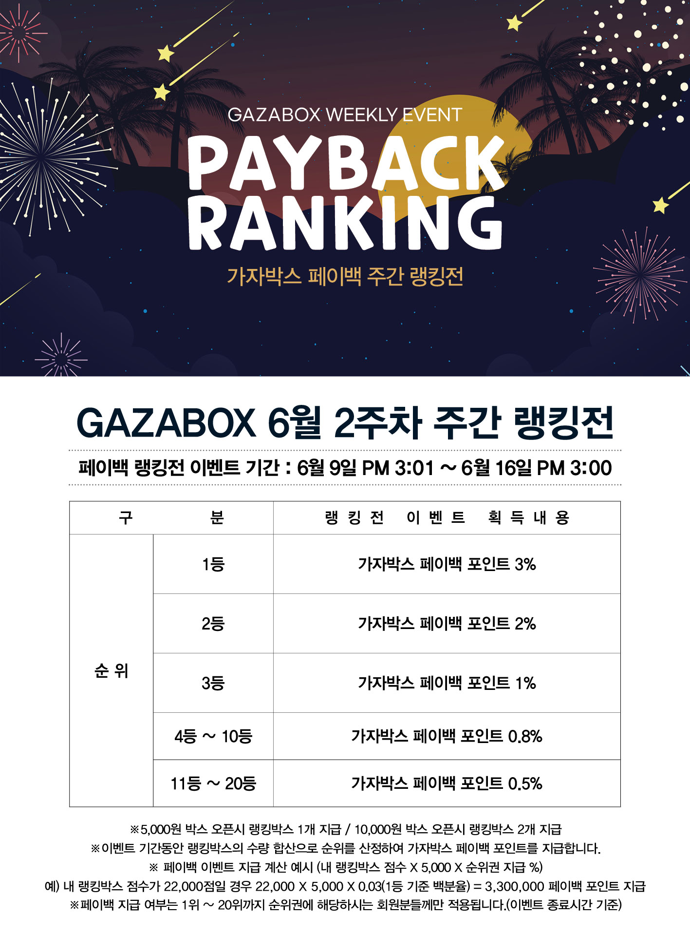 ※ 유의사항 -GAZABOX 회원만을 위한 이벤트입니다. -이벤트 당첨자는 이벤트 종료일 박스보관함을 통해 상품을 확인하실수 있습니다. -본 이벤트는 운영 상황에 따라 사전 고지 없이 변경되거나 종료될 수 있습니다. -랭킹전 진행시 회원님의 닉네임 변경을 하게되면 랭킹에 표기된 닉네임도 변경되어 표시 됩니다. 회원간의 오해가 생기지 않게 랭킹전 진행시에는 닉네임 변경을 지양하여 주세요. -개인정보의 수집 및 이용동의 *수집.이용목적 : 이벤트 경품 발송 *수집하는 개인정보 항목: (경품수령인명,휴대전화번호,경품받으실주소) *개인정보의 보유 및 이용기간 : 경품 발송후 정보 파기